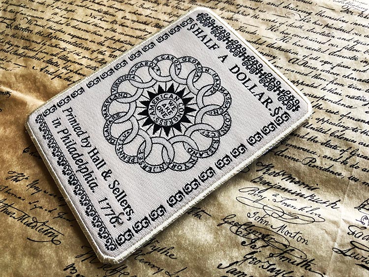1775: Great Britain viewed the American colonies as scattered, with loyalties ultimately to the throne. A culmination of diverse people groups, trades, backgrounds, and tastes, the colonies seemed an easy enemy to snuff out. But the newly formed Continental Congress members fought to overcome their differences and established a standardized currency for the 13 Colonies, relinquishing the dependency on Great Britain. Founding Father Benjamin Franklin, a renaissance man in the truest form: scientist, philosopher, politician, spearheaded the effort and the design of the Half A Dollar Bill to state with certainty the unity of these Colonies against the English crown. The colonial form of money called Continentals was not backed up by gold or silver like the British Pound. Although these notes were later devalued, the Half A Dollar stood for something more then currency alone. The words WE ARE ONE in the middle of this bill signify that even in the turbulent and uncertain times that promised peril and possible death for the patriots, they would be united as one no matter the outcome because they were taking a stand for the natural rights of life, liberty and the pursuit of happiness. This patch commemorates our founding father’s efforts to establish a government that truly represented its people, from all backgrounds with natural rights and liberty for all.