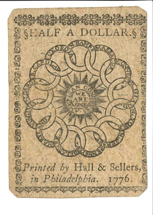 "Franklin also recuperated his lifelong interest in creating symbolic designs that would have meaning as they were being exchanged. He used his favorite emblem book, Joachim Camerarius’s Symbolorum ac Emblematus Ethico-Politicorum (Latin for “Ethical and Political Symbols and Emblems”). Camerarius’s book was popular and was reprinted often. Franklin’s own copy of the book was a German publication from Mainz, dated 1702; it is housed at the Library Company of Philadelphia, the library Franklin began. One of the reasons British leaders thought the American colonies would never rebel was that the colonies were too diversely settled, and they produced different products and thus operated on different economies. But the era of non-importation had taught the American people that they could be self-sustaining if they worked cooperatively. This is the meaning behind Franklin’s expression on the Continental currency, “WE ARE ONE.” Surrounding the “WE ARE ONE” expression on the Continental bills is another image Franklin devised, based on classic sources: interlocked circles forming a circle. The image allows to each colony its own identity (each circle is marked with a different colony’s name) while creating a visual impression of unification, indicating that “we are one. These interlocked circles were used on different issues of continental bills across 1776, on a New Hampshire regimental flag in 1777, on a Massachusetts company flag, and eventually on a set of china that Robert Morris asked Josiah Wedgwood to create for him when he served as the U.S. Agent of the Marine.”